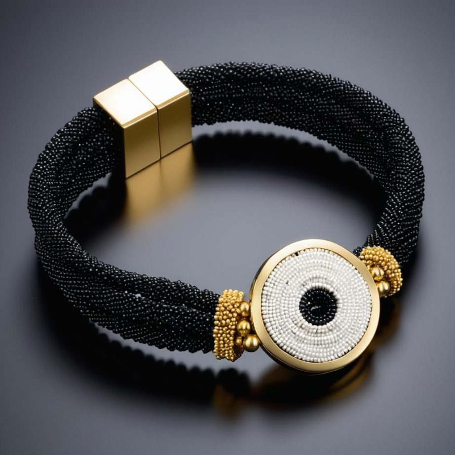 在这款手链的设计中,黑白双色的织物被巧妙地编织在一起,形成了一种简约而不失层次感的风格。金属线的加入,不仅丰富了整体的视觉效果,同时也为设计增添了一份精致感。通过这种色彩与材质的结合,设计师可以探索更多的可能性。例如,将这种简约风格应用于更复杂的串珠设计中,利用不同材质的珠子来增加质感,或者通过不规则形状的珠子和金属线的组合,创造出具有视觉冲击力的中心装饰点。这样的创新设计,不仅符合现代珠宝设计的潮流,也具备了独特的艺术感染力。